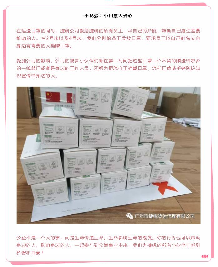 4月6日文昌市衛(wèi)生健康委員會(huì)為馬來(lái)西亞捐贈(zèng)的10箱貨物,所有貨物都由捷帆公司免費(fèi)為文昌市慈善總會(huì)運(yùn)輸,我們很堅(jiān)定地希望與政府?dāng)y手戰(zhàn)勝疫情,為海外的僑胞們送去祖國(guó)的溫暖。 無(wú)論我們做不做公益,世界都會(huì)發(fā)生變化;但做了,改變的就是自己。 在我們看來(lái),公益并不是遙不可及的行為,而是一個(gè)人、一個(gè)團(tuán)隊(duì)、一家公司所選擇的非常平常的生活方式。